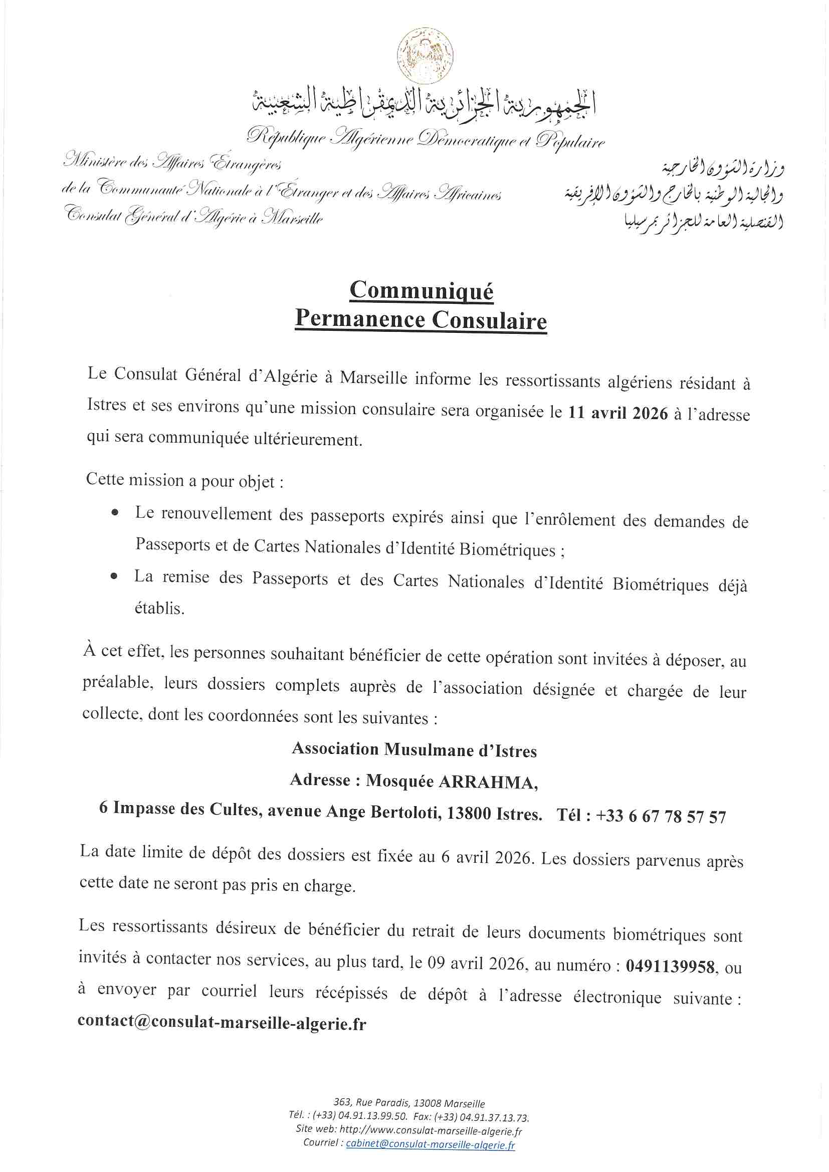 Le Consulat Général d’Algérie à Marseille informe les ressortissants algériens résidant à Istres et ses environs qu’une mission consulaire sera organisée le 11 avril 2026 à l’adresse qui sera communiquée ultérieurement.